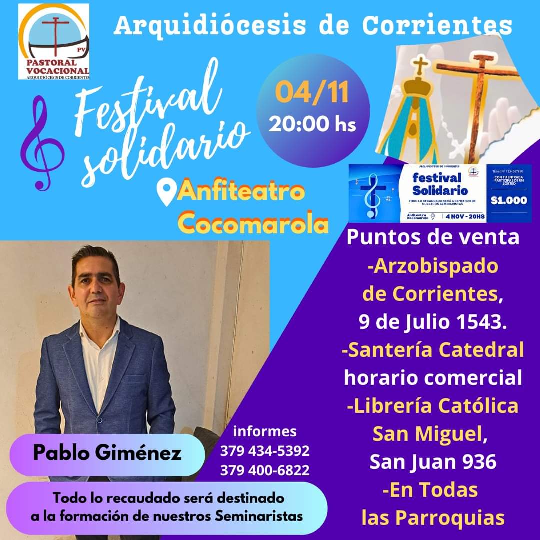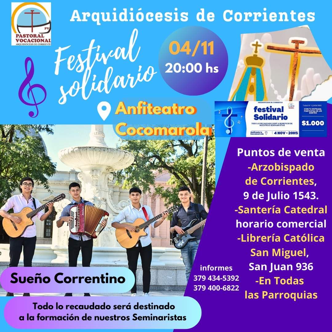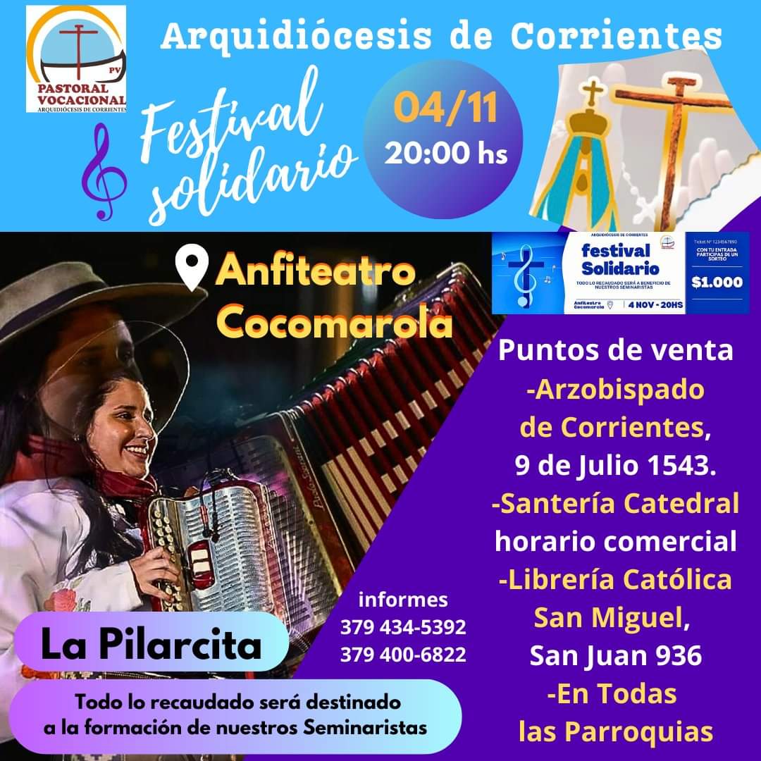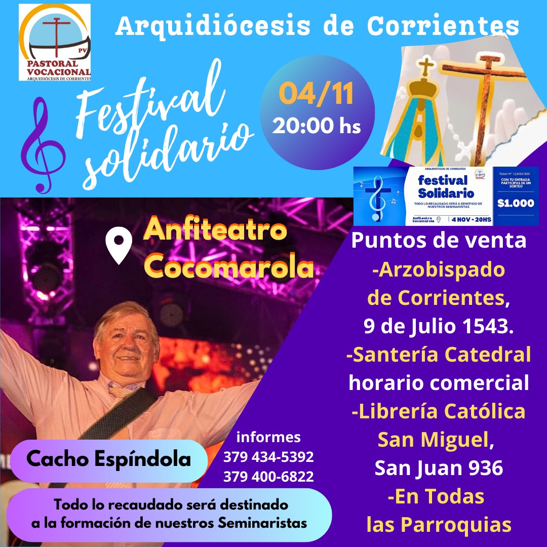 Se viene el Festival Solidario para ayudar al sostenimiento de nuestros jóvenes seminaristas. Se realizará el sábado 4 de noviembre en el Anfiteatro Cocomarola. Reconocidos solistas y conjuntos chamameceros se subirán al escenario para compartir su música, a partir de las 20. Habrá sorteos con importantes premios.