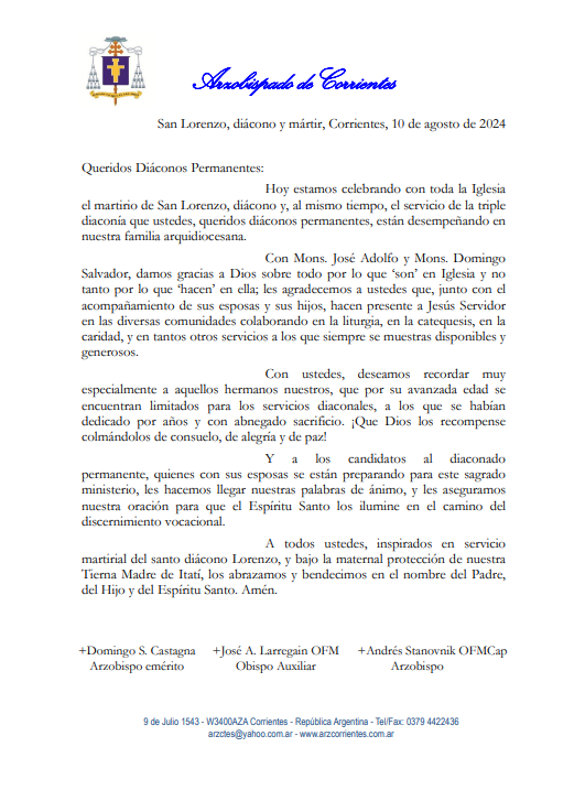 A todos ustedes, inspirados en servicio martirial del santo diácono Lorenzo, y bajo la maternal protección de nuestra Tierna Madre de Itatí, los abrazamos y bendecimos en el nombre del Padre, del Hijo y del Espíritu Santo. Amén.