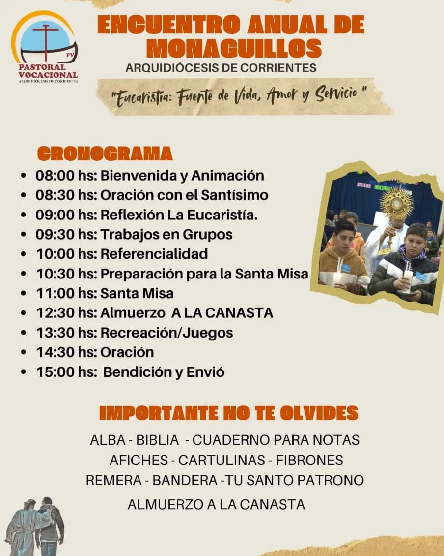 El Encuentro se iniciará a las 8 y se extenderá hasta las 15. Además de compartir un momento de adoración al Santísimo Sacramento, los monaguillos tendrán tiempos para charlas, trabajos en grupos, recreación y juegos.