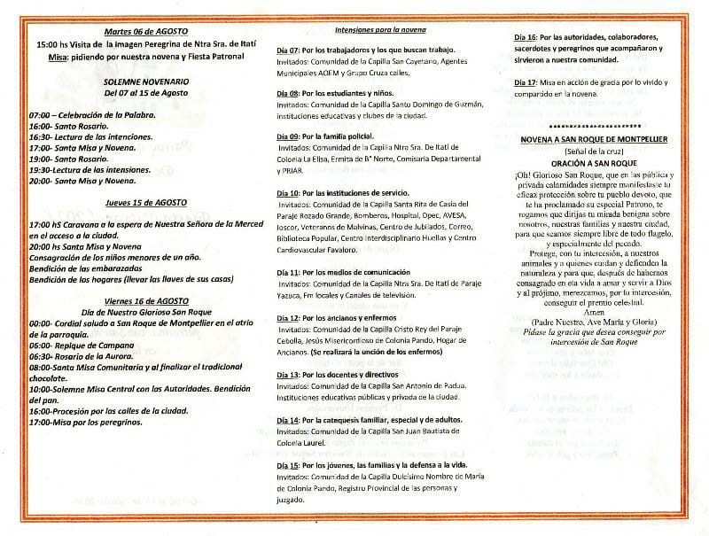La novena se inició con la llegada de la imagen peregrina de la Virgen de Itatí. Todos los días, a las 7, hay celebración de la Palabra; por la tarde, a las 16, se reza el Santo Rosario, a las 16.30, se leen las intenciones del día y, a las 17, se celebra la Santa Misa y se rezan las oraciones de la novena. A las 19, Rosario, luego intenciones y a las 20, celebración eucarística.