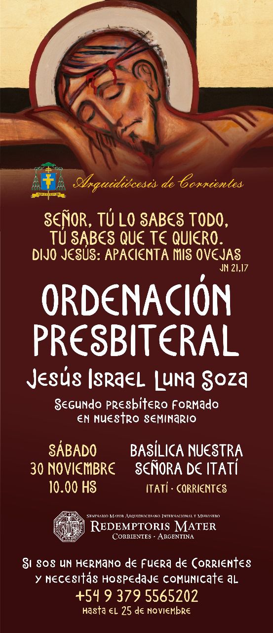 Este sábado, la Iglesia particular de Corrientes vivirá un acontecimiento de gracia. Por la imposición de manos del Arzobispo y la oración de todo el pueblo de Dios, Jesús Israel Luna Soza será ordenado sacerdote. La ceremonia se desarrollará durante la Santa Misa, que a las 10, se celebrará en la basílica de Nuestra Señora de Itatí.