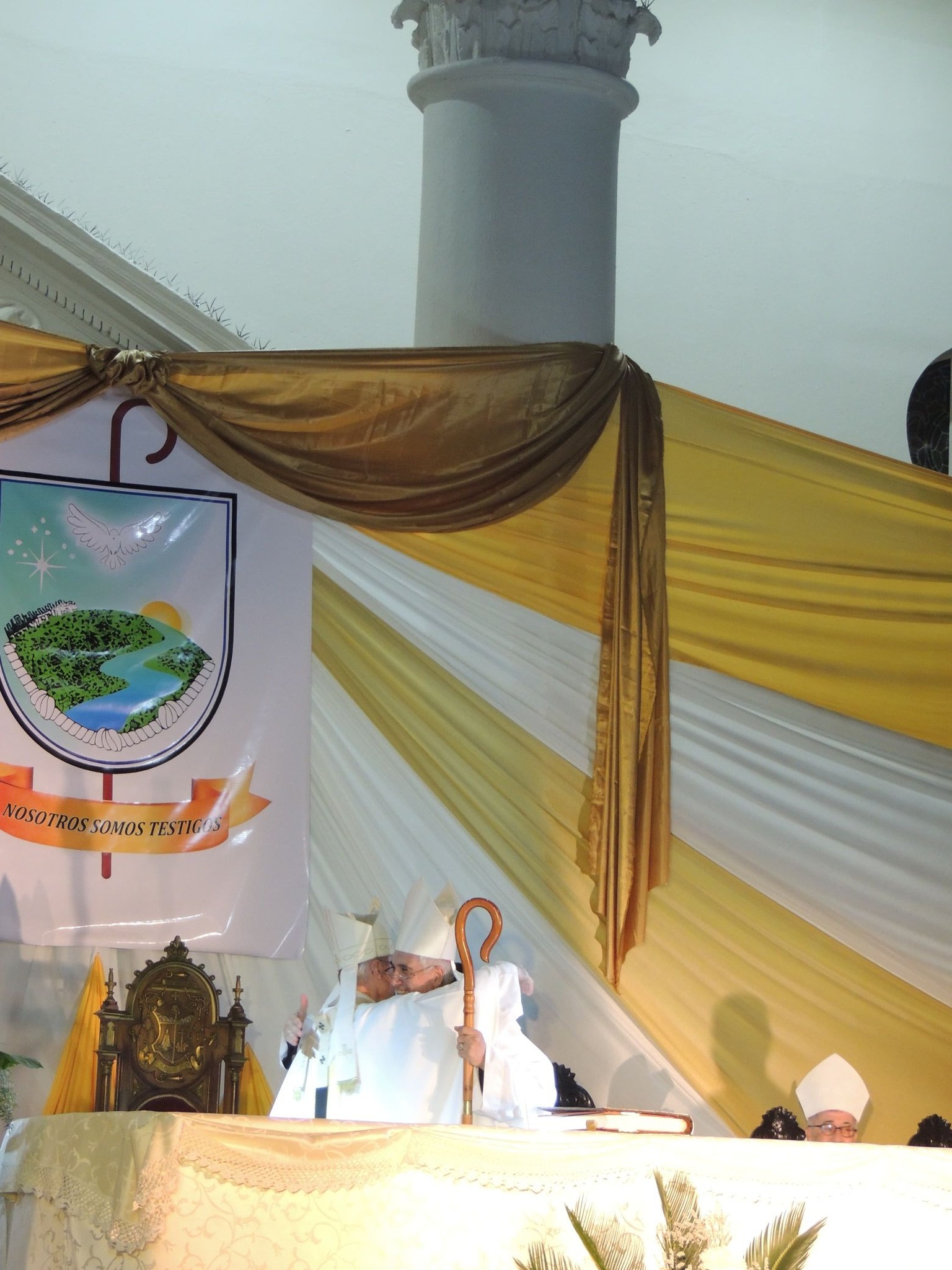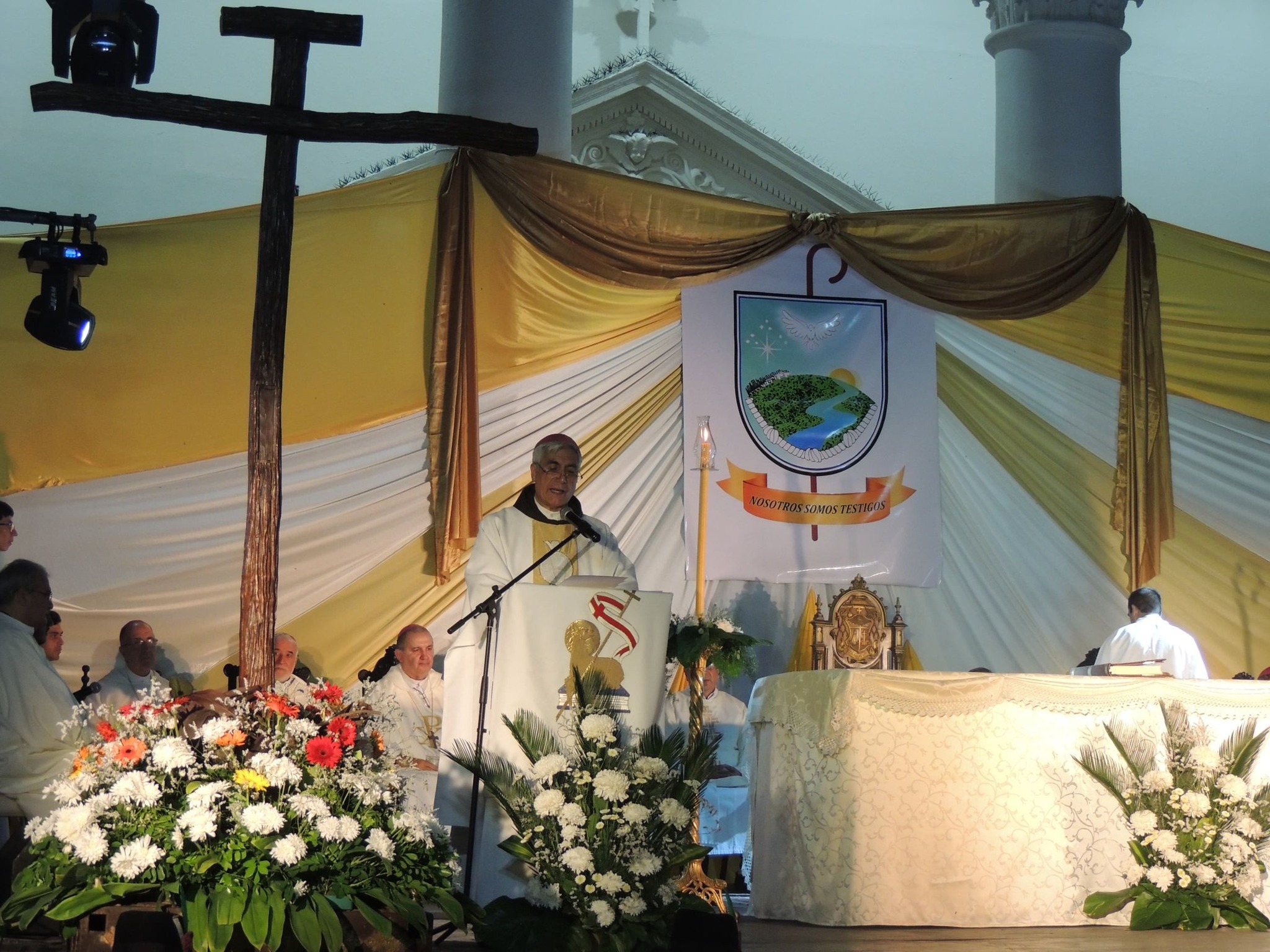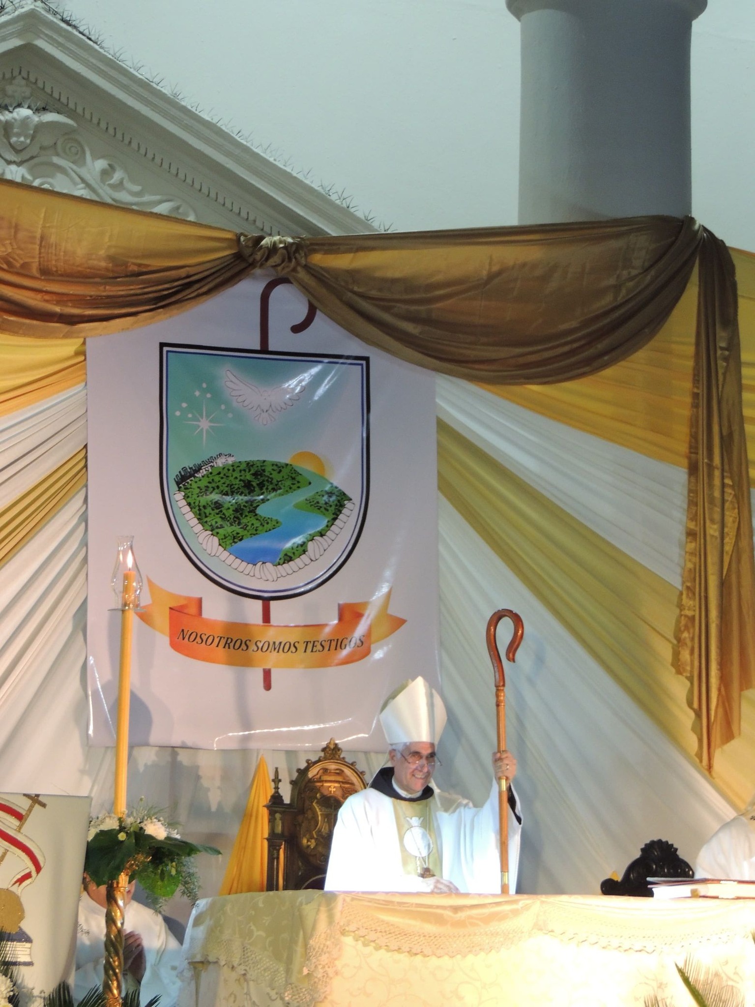 Detrás del altar en el que se celebró la eucaristía estuvo, desde muy temprano, un cartel impreso con el lema elegido por el nuevo Arzobispo de Corrientes para su ministerio pastoral: “Nosotros somos testigos”; una frase pronunciada por los apóstoles de Jesús, documentada en diferentes ocasiones en el libro de los Hechos de los Apóstoles y pronunciada hasta la saciedad por los fieles que acudieron a la toma de posesión.