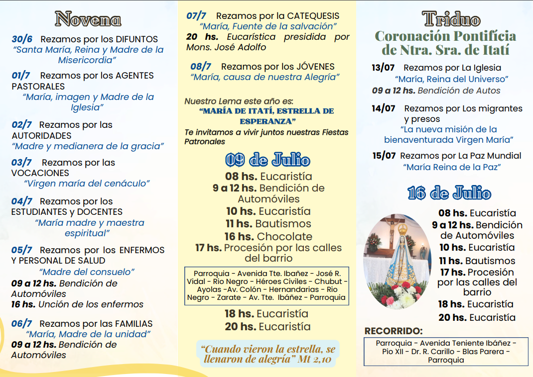Como preparación al aniversario de la Coronación Pontificia de la Virgen de Itatí, que se conmemora el 16 de julio, la parroquia llevará adelante un Triduo de oración los días 13, 14 y 15 de julio, con intenciones por la Iglesia, los migrantes y personas privadas de libertad, y por la paz mundial.