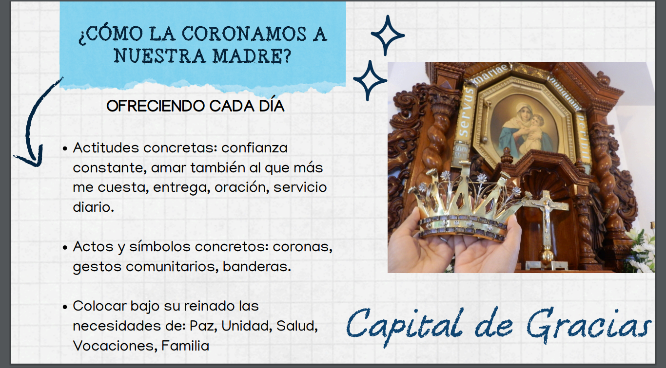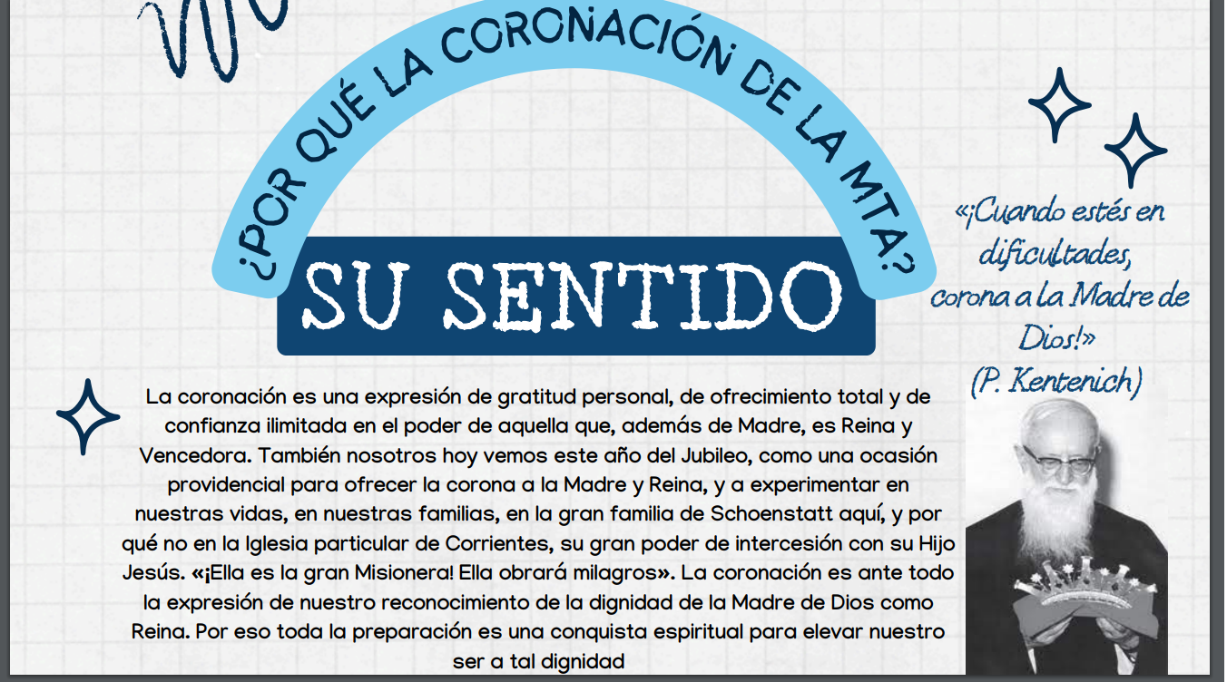 La corona que será colocada a la imagen fue confeccionada por las Hermanas de María en Santa María, Brasil, en el único taller en el mundo en el que se realizan trabajos de Schoenstatt. Llegó a Corrientes en junio, en el marco de una peregrinación organizada por el Movimiento Apostólico de Schoenstatt de la Arquidiócesis correntina, junto a hermanos de Chaco, Reconquista y Formosa.