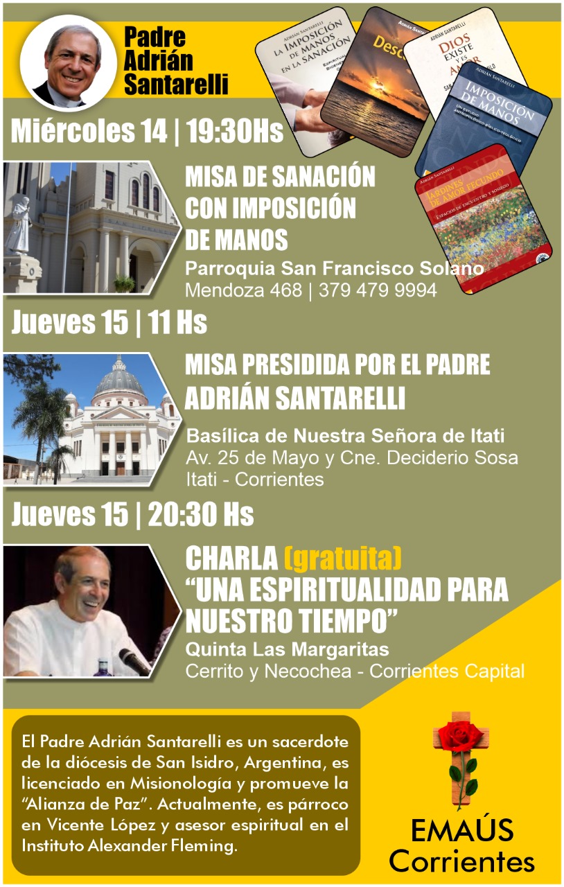 El miércoles estará en la Arquidiócesis el padre Adrián Santarelli, sacerdote de la diócesis de San Isidro, invitado por el grupo Emaús. Celebrará la Santa Misa a las 19.30 en la parroquia San Francisco Solano donde hará imposición de las manos.