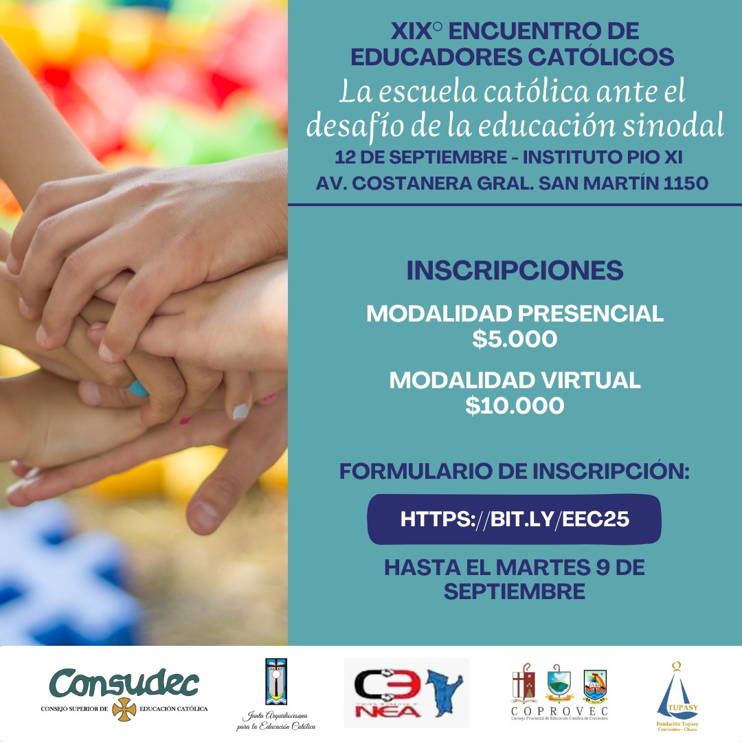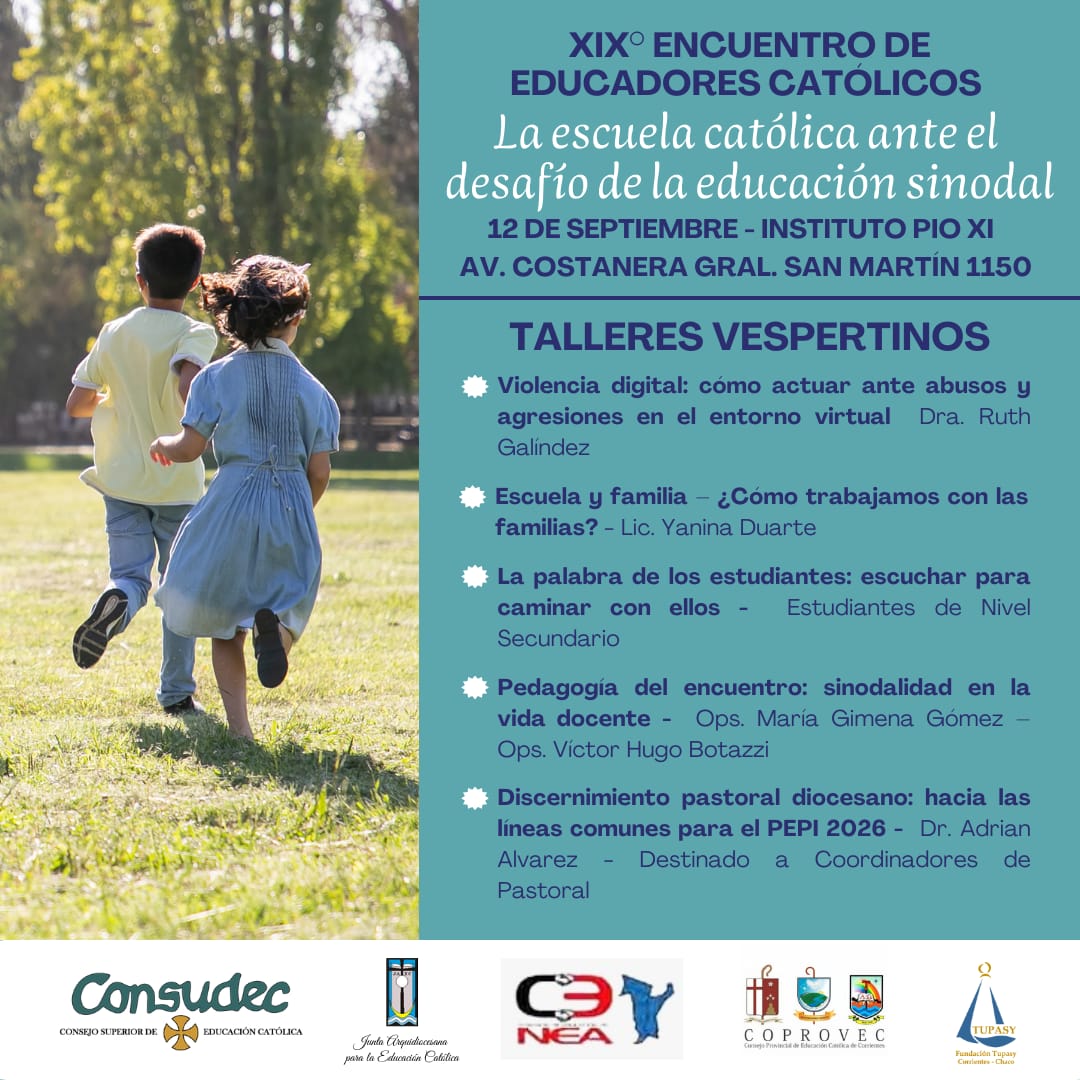 Este viernes se desarrollará el XIX Encuentro de Educadores Católicos, bajo el lema “La escuela católica ante el desafío de la educación sinodal”. La jornada tendrá lugar en el Instituto Pío XI, desde las 8 hasta las 17.30, y reunirá a docentes de la capital y delegaciones del interior.
